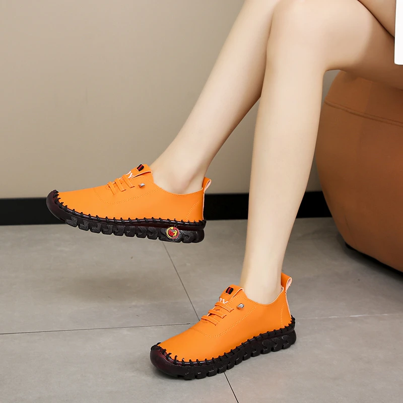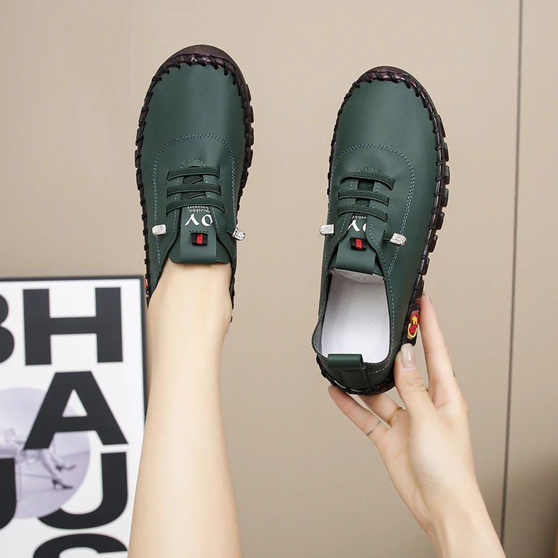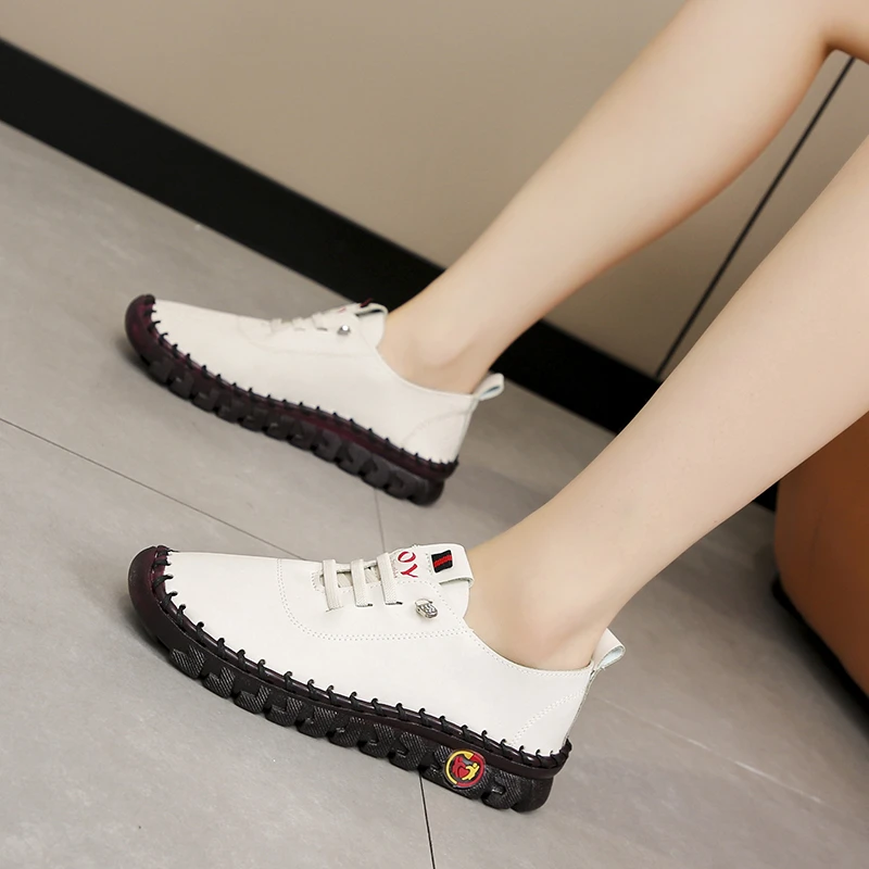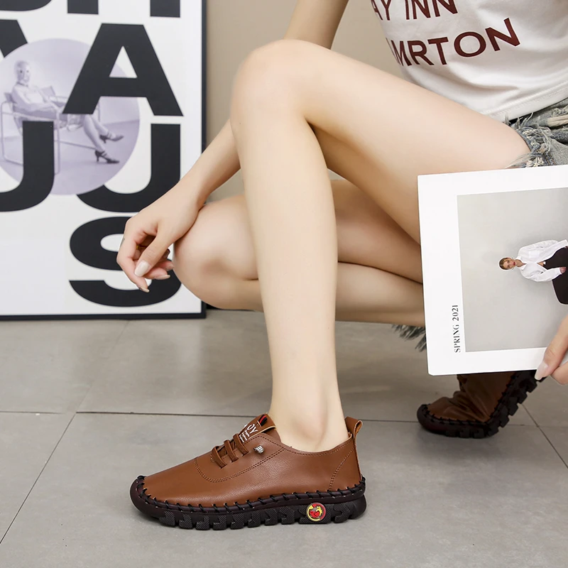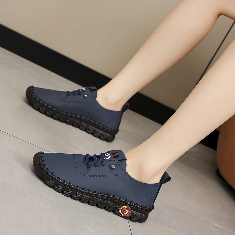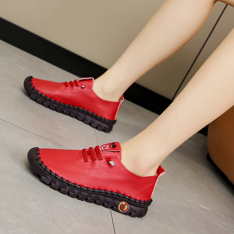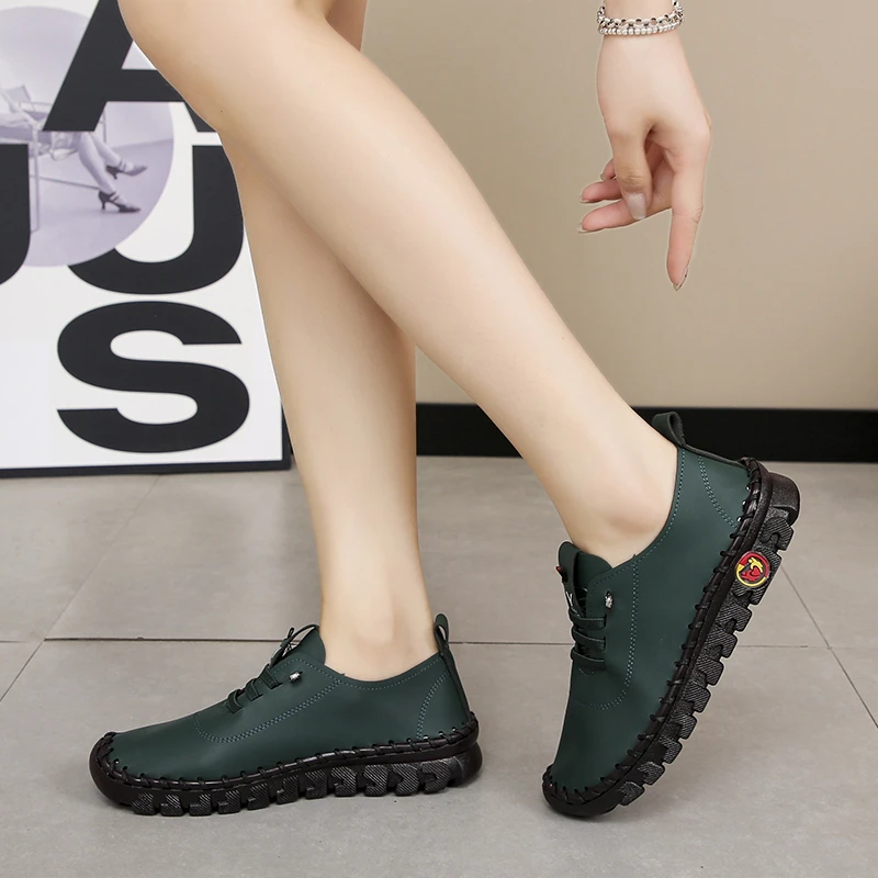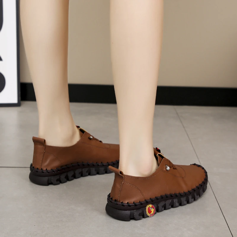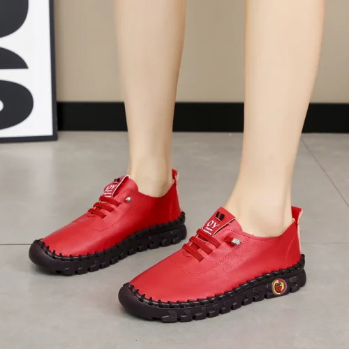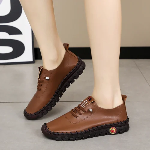 Leisure Leather Women’s Flat Shoes – Anti-Slip Lace-Up Round Toe Casual Sneakers