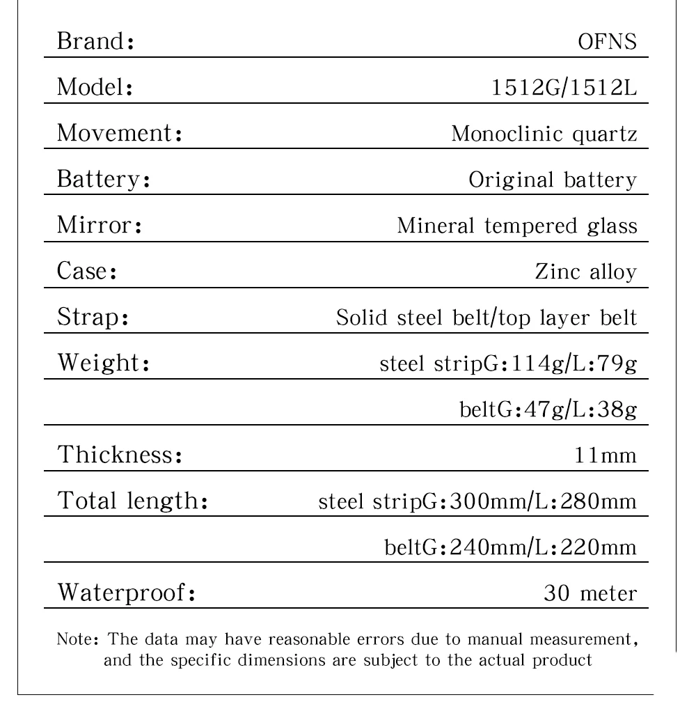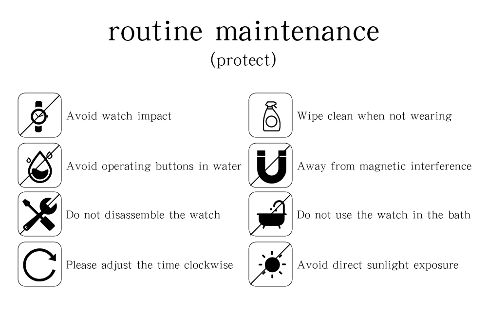 Note 1: The watch should not be used with hot and warm water, as water vapor can enter the watch and can only prevent cold water from entering. Do not expose the watch to any chemical cost cosmetics, chemical and corrosive daily necessities. (Because these chemical costs will corrode the coating color on the surface of the watch) 3. The size of the watch is measured manually and there may be some error. Please refer to the actual product for details.