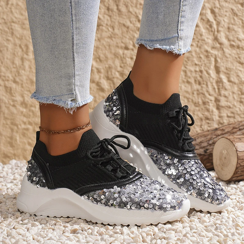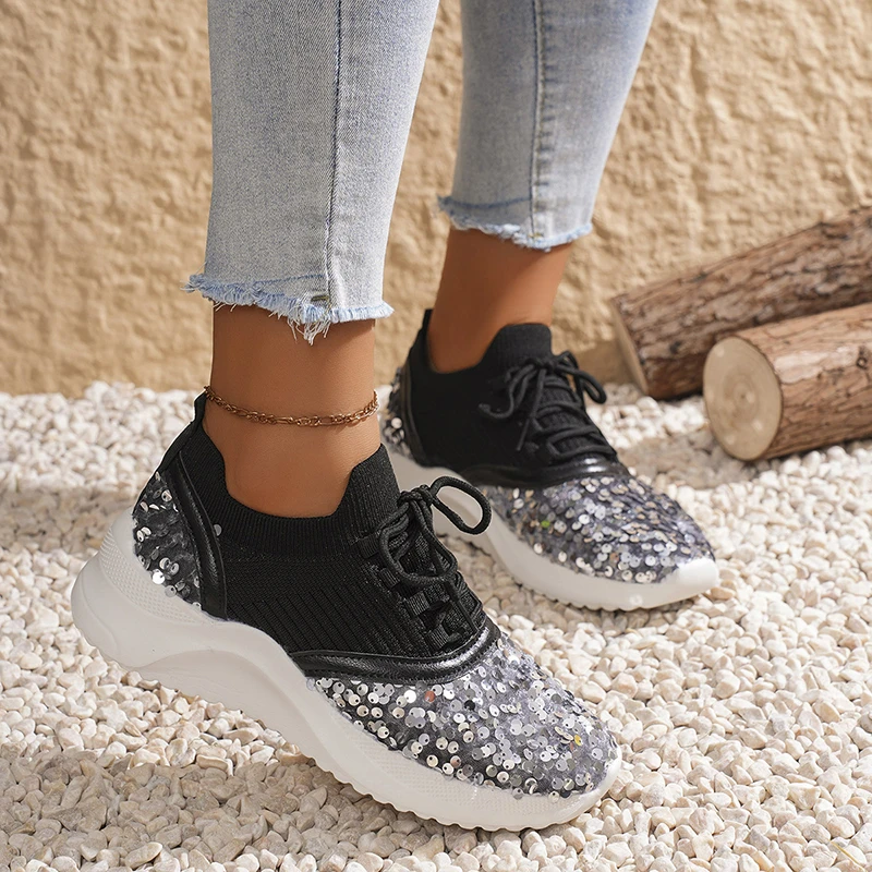 Be the first to review “Silver Glitter Platform Sneakers for Women – Breathable Patchwork Knit Flats” Cancel reply