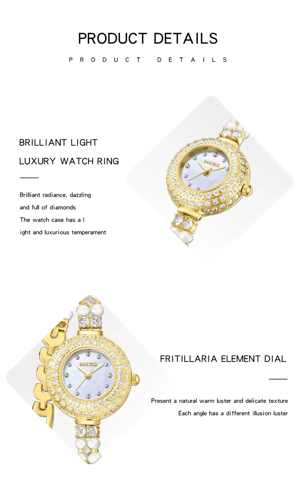 Women’s Gold Pearl Quartz Watch – Full Diamond Bracelet Style Lightweight Jewelry Timepiece