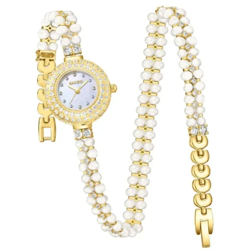 This watch boasts a luxurious design with gold pearls and full diamond bejeweling, making it a standout piece in any jewelry collection.