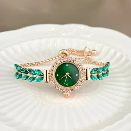 Women’s Diamond-Encrusted Leaf Quartz Watch with Adjustable Strap