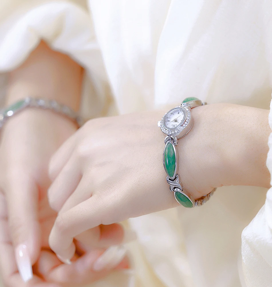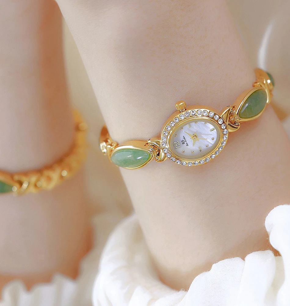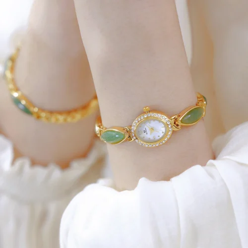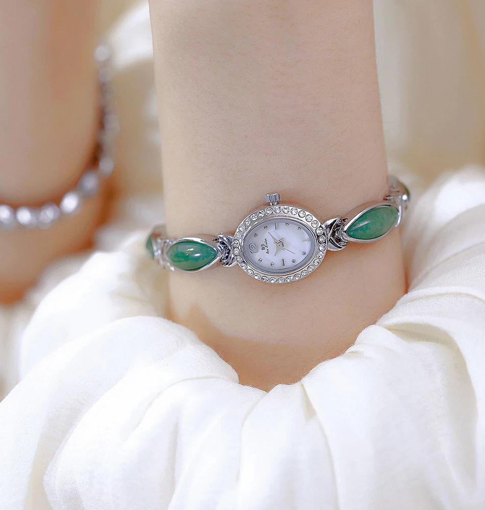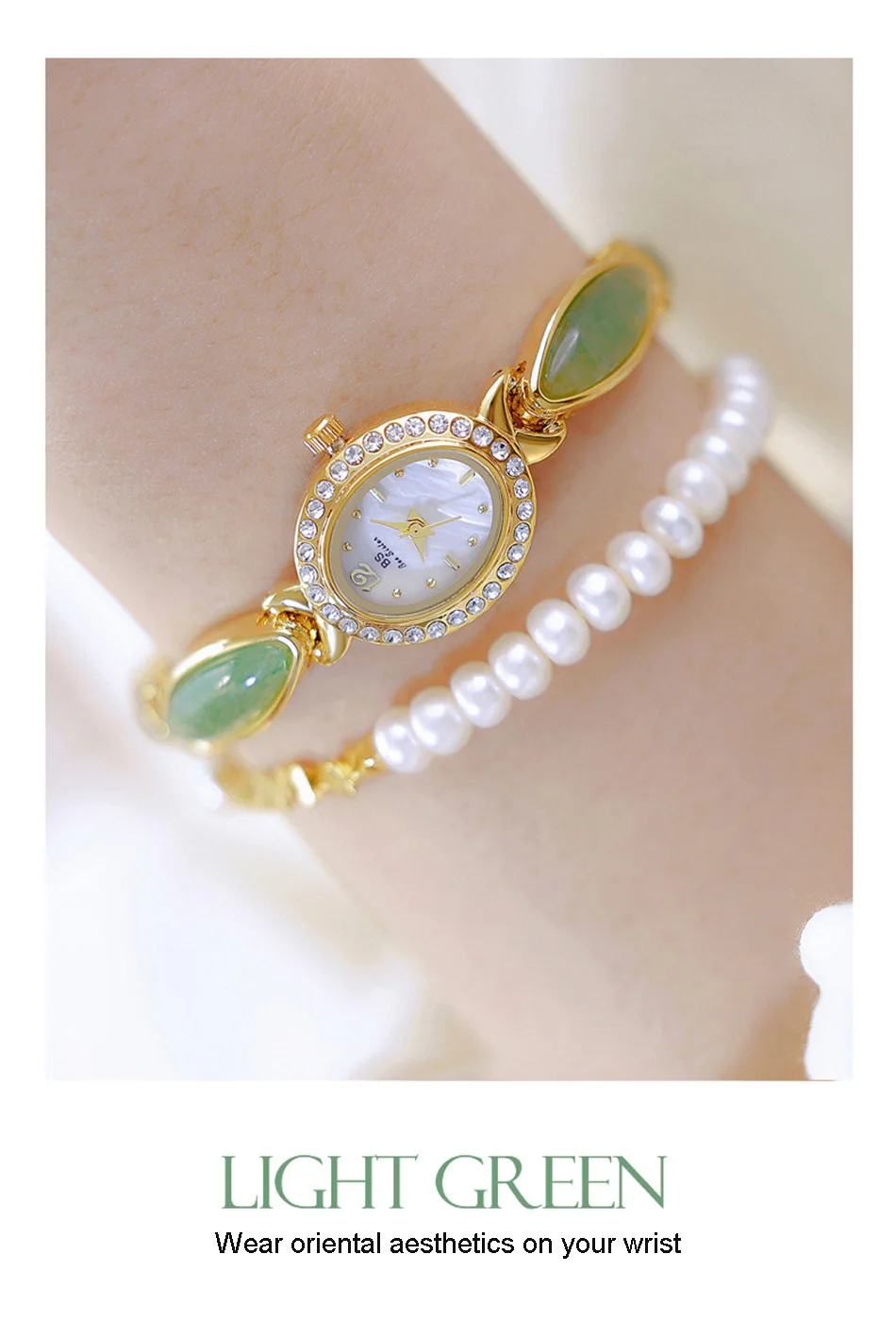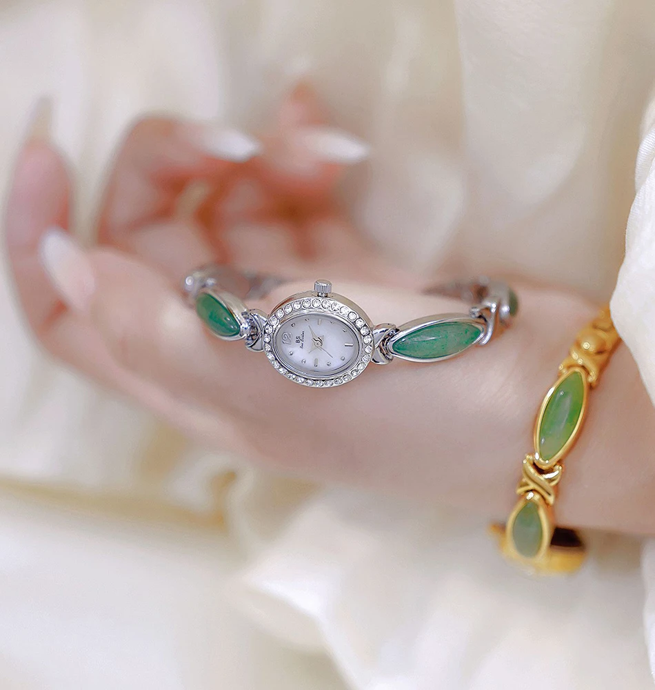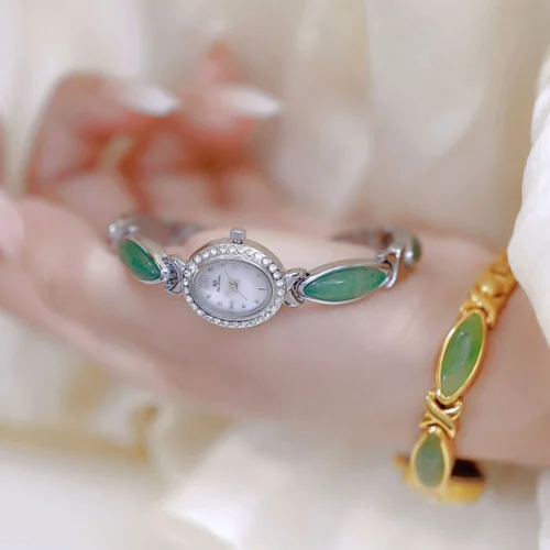 Women’s Vintage Jade Quartz Watch – Small Oval Diamond Dial & Waterproof Bracelet