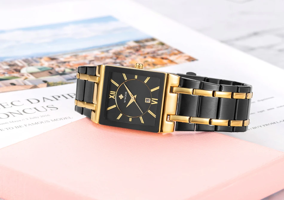 WWOOR Japanese Quartz Women’s Watch – Black & Gold Square Stainless Steel Waterproof Wristwatch